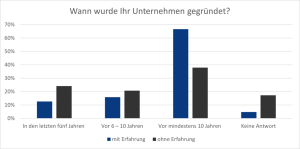 Ein Blick auf die Gründungszeitpunkte der Unternehmen verdeutlicht einige interessante Unterschiede zwischen den Unternehmen, die sich als erfahren und unerfahren einschätzen (s. Abbildung 4):
